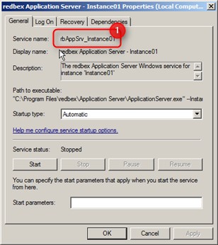 Step 1: To remove a the Windows Service for the Application Server Instance you have to know the service name. The service names for Application Server services always conform to following patternrbAppSrv_<InstanceIdentifier>. You can determine the service name by using the Windows Service Management Console. Figure 1:1 shows where the service name is displayed, when opening the properties of the service from the Windows Service Management Console.