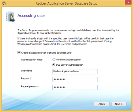 The accessing user is the user that the Redbex Application Server (once installed) will use to connect to the database that is installed here.
