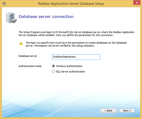 The credentials used to logon to the specified database server and to create the new database can be either a Windows domain account or a local database login. The Setup Program supports Windows domain user accounts only if both the Database Server and the computer on which the Setup Program is executed are in the same Windows domain.