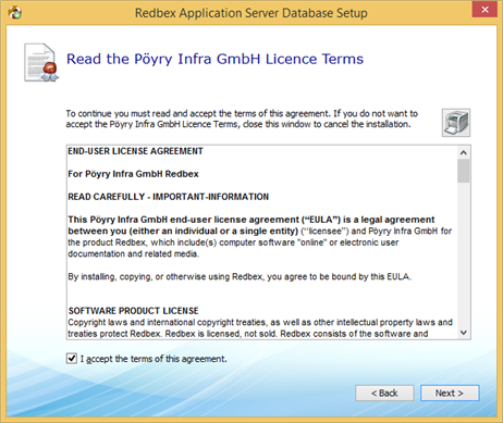 At this point the Setup Assistant asks you to acknowledge the End User License Agreement of Redbex. If you have not done so before we encourage you to read through the License Agreement and then select I accept the terms of this agreement.