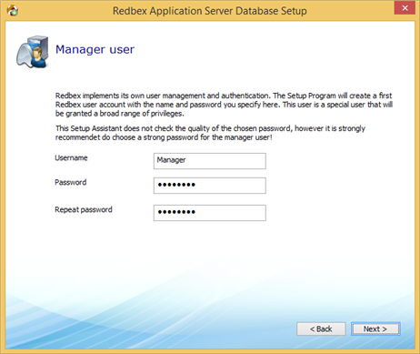 Redbex implements its own user and authentication system. To be able to log on to the Application Server a first user has to be created. In this step the Setup Assistant asks you for a name and a password for that user. Since this is the user that will be used to create other users and to do the initial configuration of the system we refer to this user as the manager user, we also suggest to use Manager as username.