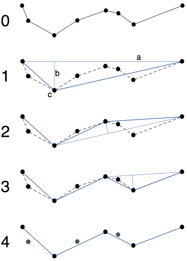 The simplification is done by applying the well known Douglas Peucker Algorithm. The purpose of the algorithm is, given a curve composed of line segments, to find a similar curve with fewer points. The algorithm defines 'dissimilar' based on the maximum distance between the original curve and the simplified curve. The simplified curve consists of a subset of the points that defined the original curve.