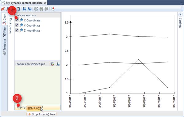 Pins in a chart definition can be defined as dynamic (figure 1:1). If a chart contains at least one dynamic pin the chart definition will show a drop area for dynamic content (figure 1:2). Whenever you drop features on the bindings for all pins flagged as dynamic will be changed, currently bound features will be unbound from those pins and the newly dropped features will be bound.