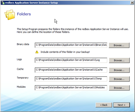 Each instance of the Application Server must use its own set of folders. While most data is stored in the Application Server Database the Application Server also uses folders to store some data. In this step the Setup Assistant asks for the location of those folders.