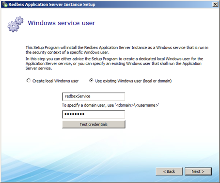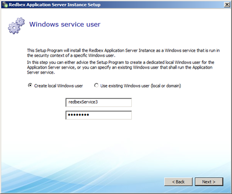 If you want to specify an existing Windows user account that should be used to run the Application Server Service select Use existing Windows user (local or domain).