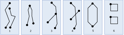 (1) is a simple Multi-Line-String instance whose boundary is the four end points of its two LineString elements. (2) is a simple Multi-Line-String instance because only the end points of the LineString elements intersect. The boundary is the two non-overlapping end points. (3) is a non-simple Multi-Line-String instance because the interior of one of its LineString elements is intersected. The boundary of this Multi-Line-String instance is the four end points.(4) is a non-simple, non-closed Multi-Line-String instance.(5) is a simple, non-closed Multi-Line-String. It is not closed because its Line-Strings elements are not closed. It is simple because none of the interiors of any of the Line-Strings instances intersect.(6) is a simple, closed Multi-Line-String instance. It is closed because all its elements are closed. It is simple because none of its elements intersect at the interiors.