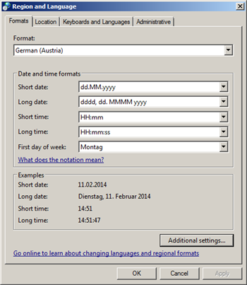 To start the Region and Language dialogue type intl.cpl on the command line or in the search field. With this dialogue you can change how date, time and numbers will be presented.