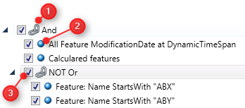 In the Expression tree combination nodes are shown with a chain link symbol (Figure 1:1) and the logical operator they represent; possible logical operators are: AND, OR, NOT AND, NOT OR . If you select a combination node in the Expression tree you can configure the logical operator in the Details area. The context menu of a combination node allows you to add subordinate combination nodes or filter terms. All combination nodes except the root node can be deleted. Deleting a combination node will also delete all its subordinate combination nodes and filter terms.