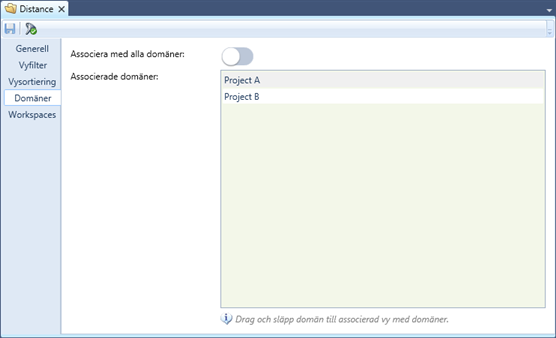 The Domains tab allows you to associate a view with one or more domains. To associate the view with all domains use the respective Switch. To associate a view only with specific domains drag those domains to the list of domains. Note that the association is not inherited by subordinate domains. or subordinate views.