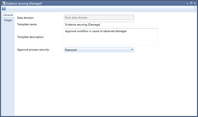 The window shows two tabs General and Stages. On the General tab (figure 1) some general information about the Approval template can be set. The Domain field is read-only and shows which domain this template is assigned to. The domain assignment is defined when the approval template is created. Name and Description fields help you to identify the approval template and should describe the usage of the template.
