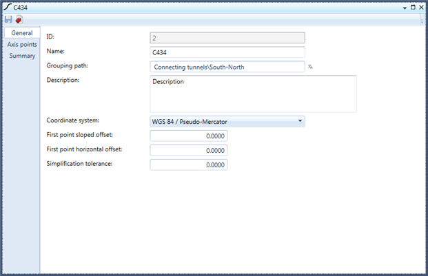 The Summary tab shows a simple graphical representation of the axis, i.e. a 3D poly-line connecting all axis points. Below the visualization a summary of the axis geometry is displayed. Table 1 explains the data shown in this summary.
