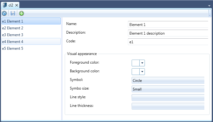 The Classification elements document window is used to display and modify a the elements of a specific classification. The window can be opened from the context menu of an classification in the Classifications window.