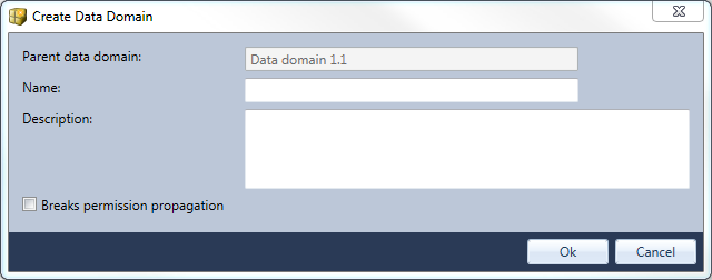 The Create Data Domain window is a modal window used to create a domain as subordinate domain of another domain. The window can be opened from the context menu of the parent domain in the Data Domain Explorer.
