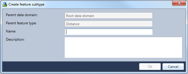 The Create Feature Subtype window is a modal window used to create a feature subtype for a specific feature type. The window can be opened from the Data Domain Explorer in the Data Domain Context area. Under Feature types select the feature type you want to create a subtype for and then select Create feature subtype from the context menu of the feature type.
