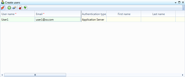 The window contain a grid control where in each row of the grid you can specify the data for a new user to be created. To add a row to the grid select Add from the window's toolbar.