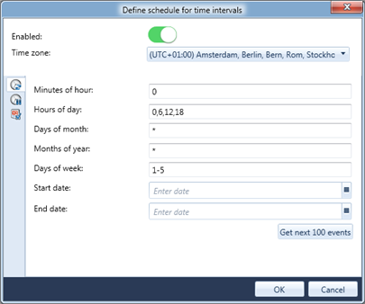 The Event Schedule window is a window modal window that is used in different places to define the Event Schedule for a specific actions i.e. the points in time when actions shall be triggered. The window is used for defining the Event Schedules of various events, e.g. for stored job definitions and Observation Plans.