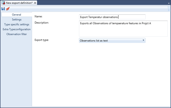 The window's content is separated into tabs. The General tab and the Settings tab are always shown. The tabs Type specific settings, Extra Type Configuration and Observation Filter are only available if an Export type is chosen on the General tab and if that chosen export type support those additional settings.
