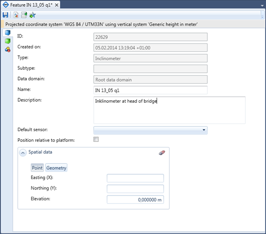 Figure 1 shows the feature editor with the base data tab opened (in this case for a feature of type Inclinometer). Some base data is write protected ant therefore the controls are shown read only.