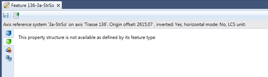 This tab shows the property structure instance for the type specific data of the feature. If the feature's type does not specify a property structure for type specific feature data this tab will be empty (as shown in figure 1), else the property structure will be automatically shown as hierarchical form.