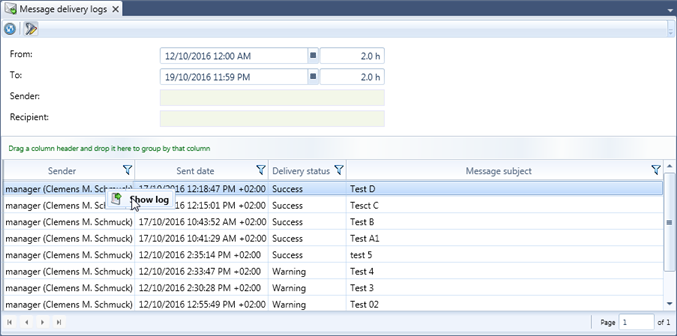 The message grid shows all messages that match the current filter criteria. Messages are shown in pages. The grid columns show some basic information for each message. Double clicking a row in the grid or selecting Show log from the context menu of a grid row will load and show the actual message delivery log in a separate window.