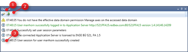 The output message severity is displayed as icon. Table 2 describes the severity levels for messages. The severity levels match the severity levels of server feedback messages. The output messages' display priority is not shown by the output messages window.