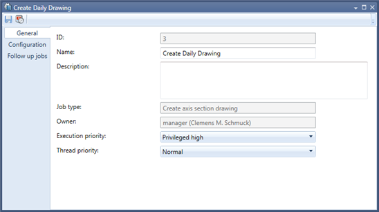 The General tab shows controls for data that is common to all job types. The ID, Job type and Owner controls are read-only. Note that the settings for Execution priority and Tread priority will only be respected if the job owner has the appropriate permissions. If these permissions are not granted the execution priority and thread priority will be automatically lowered on execution of the job.