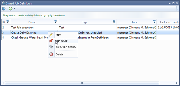 The window shows the stored job definitions in a Grid. Double click a job definition or select Edit from its context menu to open up a Job Definition window where you can modify the job definition.