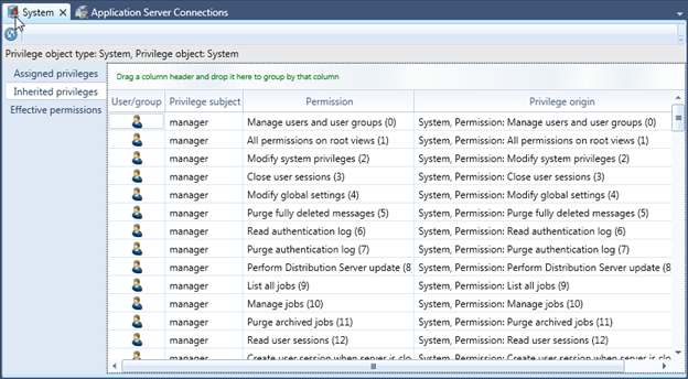 The window can be opened from the Ribbons Server Administration tab. The information bar shows the object type and the privilege object which in case of system privileges are always System.