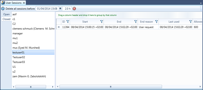 The Closed tab shows user sessions that are already closed. Due to the possibly huge amount of sessions the sessions are displayed separately for each user. If this page is active the toolbar provides the possibility to delete historic user sessions. You can select a data and after selecting Delete all closed sessions before this date will be deleted.