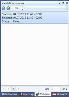 Validation runs are created and started from the validation subjects, e.g. validation on a feature is started from the Feature Explorer. As soon as a validation run has been created it will show up in this window (when data for this window is reloaded). Alternatively validation runs can be started by stored job definitions.