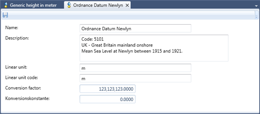 The Linear unit defines the unit used for linear measurement (i.e. measurements of elevation) in this vertical coordinate system. It is common to not only show the unit of measurement when presenting elevation values but also an abbreviation of the reference (i.e. the vertical coordinate system). The Linear unit code can be used to define such an abbreviation for the current Vertical Coordinate system. E.g. m AA (Meters above the Adriatic).
