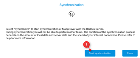 Make sure that you have internet connection. and select Start synchronization on this dialogue (figure 1:1). After this the actual synchronization of data will start and MappRover will show the progress of the synchronization in this dialogue.