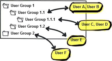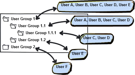 User groups can be structured tree-like in groups and subgroups. There is no system limit on the depth of that groups-tree. If a user is assigned to a subgroup he is implicitly member of all groups above and including that group in the group hierarchy. Figure 1 and 2 show an example of the membership propagation. Figure 1 shows the user to user group assignment as defined, figure 2 shows the effective user group membership.