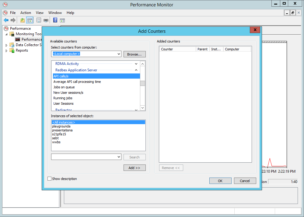 During installation the Redbex Application Server registers so called performance counters with the the Windows Performance Monitor. Performance counters are measurements of system state or activity. The Windows operating system as well as other applications you might have installed on your server provide their own performance counters. Please see the Redbex Reference Manual for a listing of all performance counters registered by the Application Server install program.