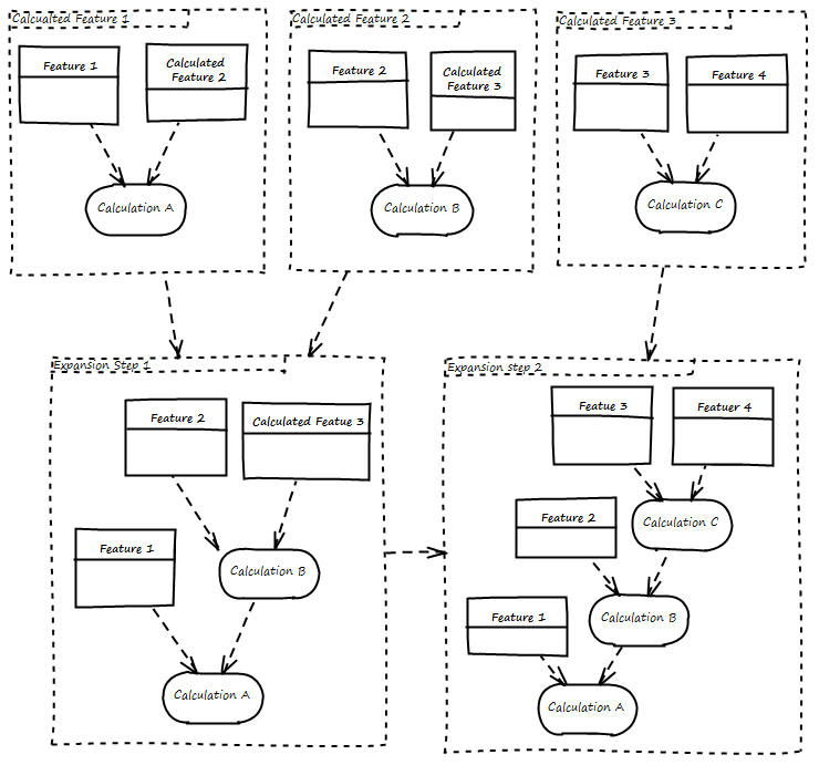 The Application Server leaves it up to the user how dependencies on other calculated features are handled by providing by providing the algorithm expansion functionality.Algorithm expansion expands the algorithm of a calculated feature with the algorithm of calculated features that are used as source features. In other words the algorithms of multiple calculated features are merged dynamically. Figure 1 shows an example of how algorithm expansion works. Note that algorithm expansion builds up a new algorithm but does not actually recalculate the calculated features it depends on.