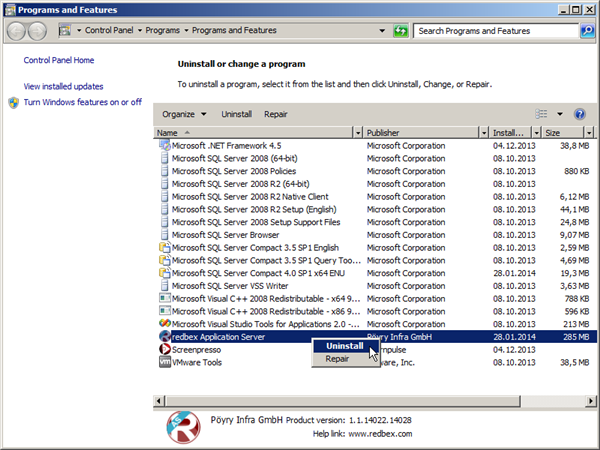 Select Redbex Application Server, and then click Uninstall on the toolbar or select Uninstall from the context menu (figure 1). If you're prompted for an administrator password or confirmation, type the password or provide confirmation.