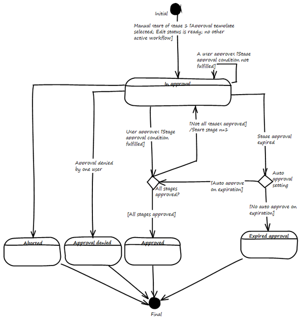 Approval workflows are always in a specific status. If the workflow is active this state of the workflow is also the Approval status of the features or observation this workflow was created for. Figure 1 shows a state diagram of an approval workflow.