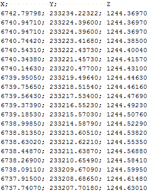 The data in the file has to be formatted in rows and columns. Each row (except the header row) describes one axis point. The first column is the X-Coordinate the second column is the Y-Coordinate and the third column is the Z-Coordinate of the axis point. Data in further columns will be disregarded.