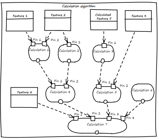 Figure 1 shows an example of a calculation algorithm consisting of seven calculations. As depicted in the example one calculation can take data input from features or other calculation steps. Any number of calculations and features can be combined in one calculation algorithm. Note that a calculation algorithm can also use calculated features as source features. Calculation 7 is the final calculation, the output of this calculation will be persisted as observations of the calculated feature or as the observations of the instantiated feature in case of instantiating calculated features.