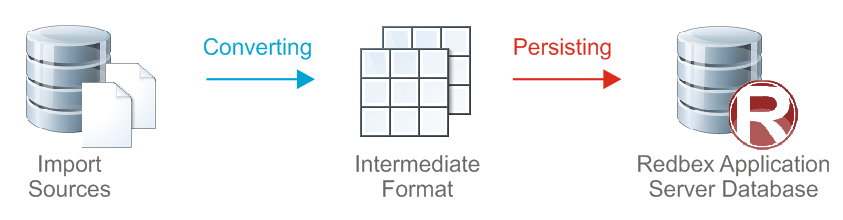 Any import is performed in two main steps. In Step 1 the import process connects to the specified data sources and transforms the data using the logic of the import type to an intermediate data format. In step 2 the import process takes data from that intermediate format and persists it to the Redbex Application Server database.