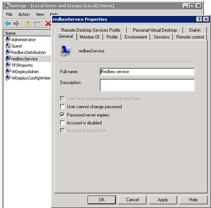 Figure 2: Typical settings for a local service user (Dialogue as seen in Windows Server 2008R2)