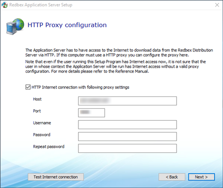 The Test Internet connection button can be used to test the proxy settings. Note that if Http Internet connection via proxy is not set this test will try to establish a direct connection to the internet (without the use of a proxy server) since the Setup Assistant has no way of knowing about the Window proxy settings of the user that will run the Application Server later. Once installed the Application Server will use the Windows default proxy settings if it was installed with Http Internet connection via proxy set to false. The test will first validate the proxy settings you specified and will then try to connect to the Redbex Distribution Server at http://distribution.redbex.com. The result of the connection test will be shown in a message box.