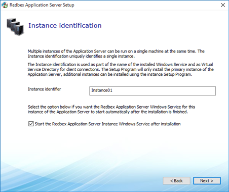 Select Start the Redbex Instance Windows Service after installation checkbox if you want the primary instance of the Application Server installed by this Setup Program to be started immediately after the installation completed. Note that regardless of this setting the Application Server Windows Service is configured by the Setup Program to be run whenever the Windows operating system starts.