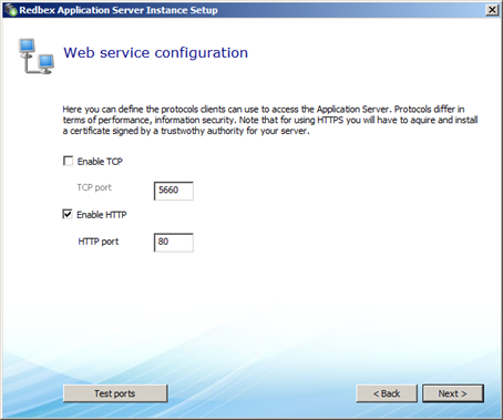 In this step of the Setup Assistant you can define the protocol configuration; select the check boxes for all protocols you want to enable. You can also change the ports on which the Application Server will provide its services. The Application Server will fail to start if it should provide services on a port that is already used by another software therefore the Test ports button provides the possibility test if the ports of the activated protocols are currently used.