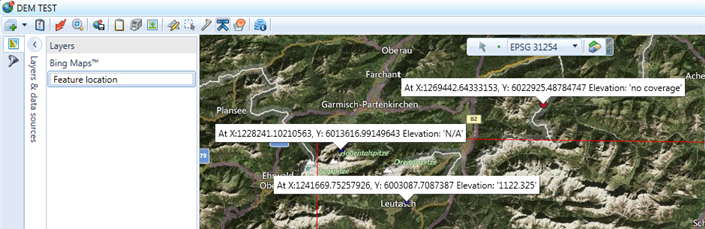 To measure the elevation of a specific point on the map select Point button in the map tool controls and click on the map. The elevation will be queried and will then be shown as a label on the map (see figure 1:3). If there is no DEM covering that specific point the label will show no coverage, if there is a DEM covering the point but the DEM does not include an elevation for that specific position not defined will be shown.