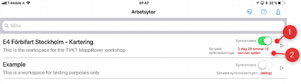 For every workspace you can decide whether the data in this workspace (construction ares, mapping events, etc) shall be synchronized with the Application Server or not. To enable synchronization for a workspace use the synchronization switch shown for each workspace in the list (see figure 1:1). If a workspace is marked as not to be synchronized it will not be deleted.