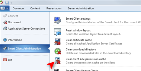 When you changing permissions on the Application Server (grant or delete privileges) it might therefore be necessary to restart the Smart Client. Alternatively you can select Clear client side permission cache in the Backstage Menu's Smart Client Administration tab.