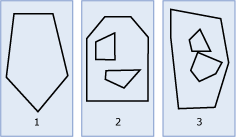 Figure 1 shows example polygon geometries (1) is a polygon instance whose boundary is defined by an exterior ring. (2) is a polygon instance whose boundary is defined by an exterior ring and two interior rings. The area inside the interior rings is part of the exterior of the Polygon instance.(3) is a valid Polygon instance because its interior rings intersect at a single tangent point.