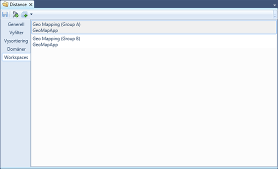 The Workspaces tab allows you to expose the current view as one or more workspaces. If this tab is active the toolbar shows the Add new workspace drop-down button. From this drop-down button you can select a workspace type and create a new workspace of that type. To edit an existing workspace select the workspace in the list view and select Edit from the context menu of the list entry or double click a workspace. Creating and modifying a workspace will bring up the Workspace window. To delete a workspace select delete from the context menu of that workspace or press Del.