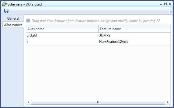 The Alias names tab is where you define alias names for features within this alias scheme. The alias names are defined within a grid. To add features for which you want to define alias names drag and drop those features from the Feature Explorer window to the grid. Afterwards select each grid row and define an alias name by first pressing F2 and then typing in the new alias name. You can also use F2 to change the name of an existing alias.